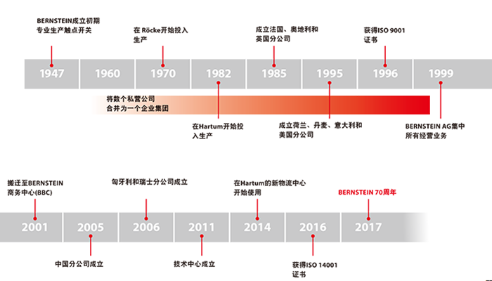在Weimar时期,Bernstein兄弟在莱比锡创办了“Monopol”公司,为电气建筑服务控制系统生产和制造低压产品。第二次世界大战结束后,现任董事长的父亲,Hans Bernstein先生和他的家人在西德定居下来。
